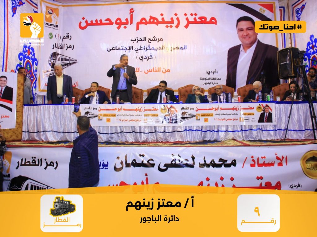 نظم الحزب المصري الديمقراطي الاجتماعي مؤتمرًا جماهيريًا حاشدًا بمركز الباجور بمحافظة المنوفية، لدعم مرشح الحزب معتز زينهم أبو حسن، الذي يخوض السباق الانتخابي على المقعد الفردي بدائرة الباجور، تحت رمز "القطار" رقم (9).