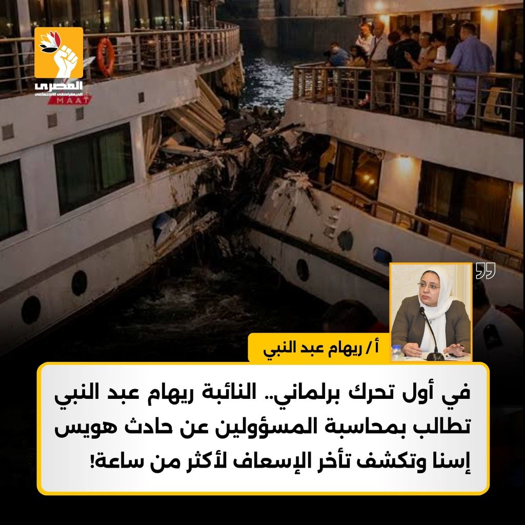 وختمت النائبة ريهام عبد النبي بأن ما حدث في هويس إسنا يكشف عن خلل خطير لا يحتمل التأجيل، سواء في منظومة السلامة الملاحية أو سرعة التدخل الطبي، وتأخر الإسعاف لأكثر من ساعة في حادث يخص سائحين أجانب أمر يسيء لصورة مصر السياحية. ولن نقبل بمرور الواقعة دون محاسبة واضحة وصريحة لكل من قصّر أو أهمل، حفاظًا على أرواح الضيوف وسمعة السياحة النيلية المصرية.